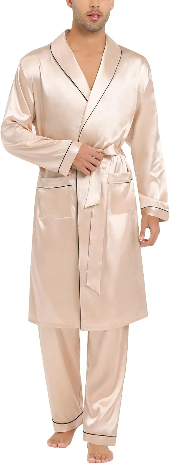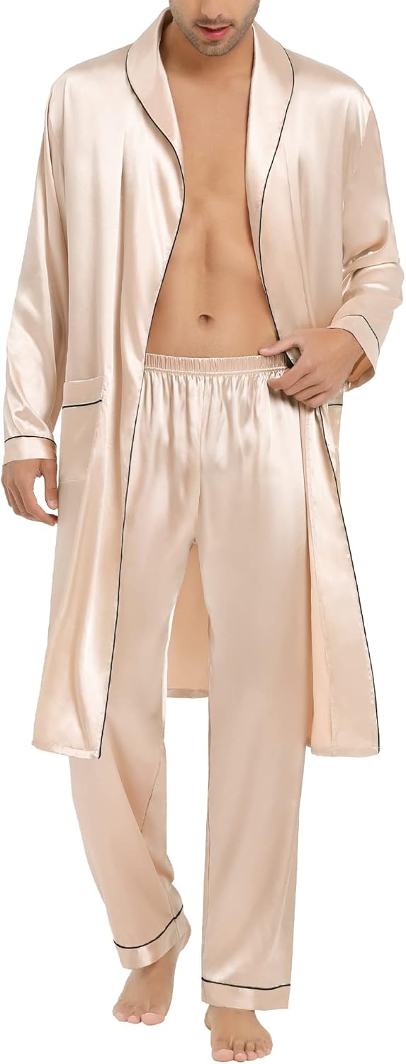- 🛀Various Occasions: Mens Silky robe set’s design is cool and looks high-end, perfect for mornings just waking up and not trying to find a shirt, an excellent choice for bath, shower, loungewear, swim pool, hotel, vacation, party, wedding, sauna, spa, hot tub, gym, and leisure time