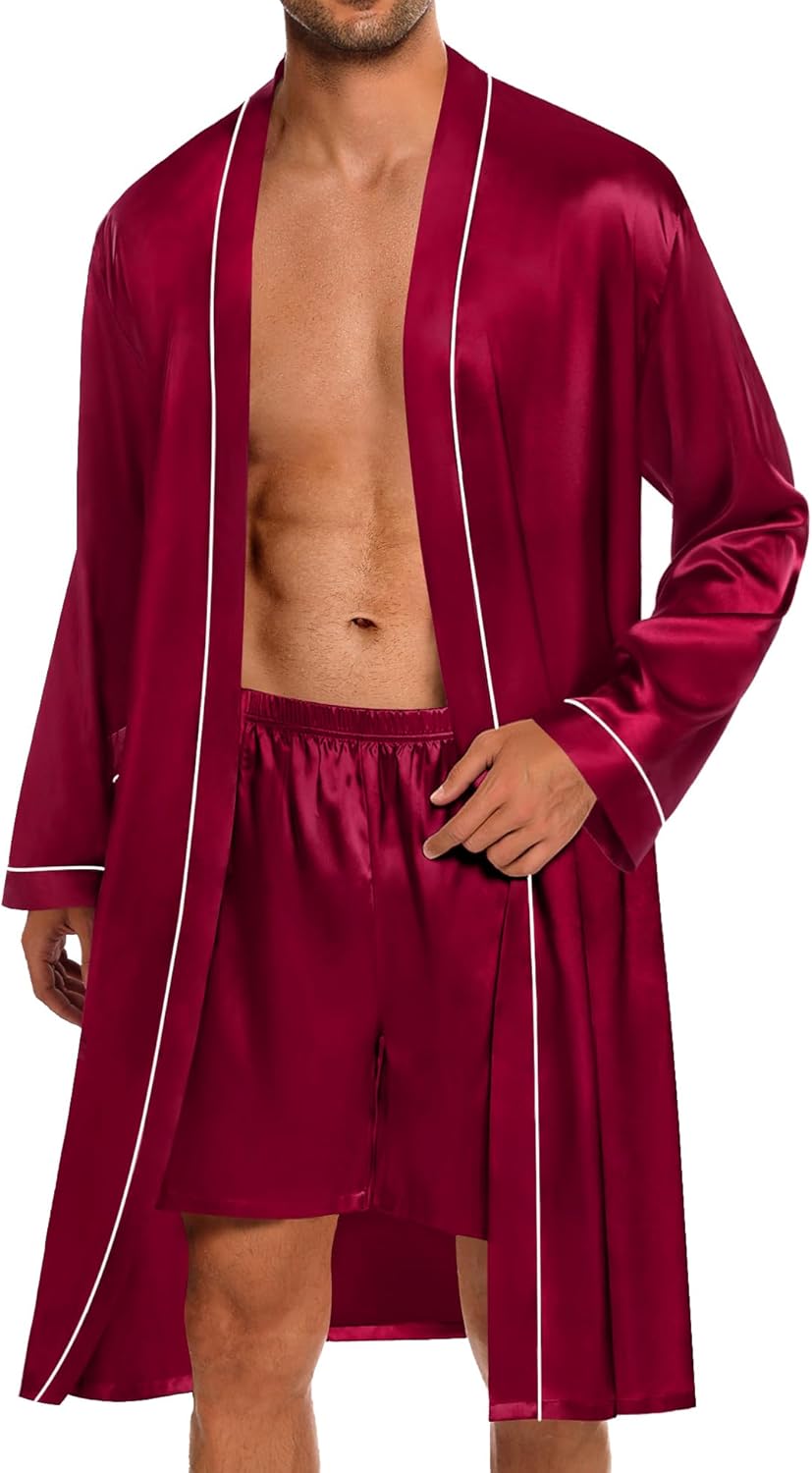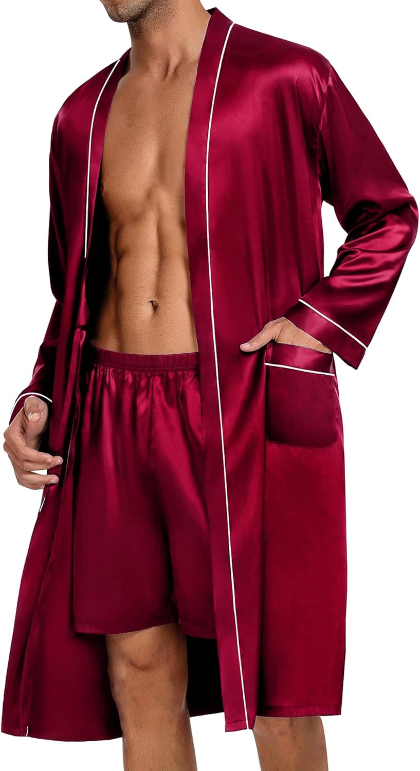 • Mens 2 PCS Silky Robe Sets: Men Kimono Bathrobe set features a knee-length, long-sleeve robe with TWO SIDE POCKETS, an adjustable/removable belt, and inside ties, easy to put on and take off. Men’s Pajama Shorts with elastic waistbands to fit any body size