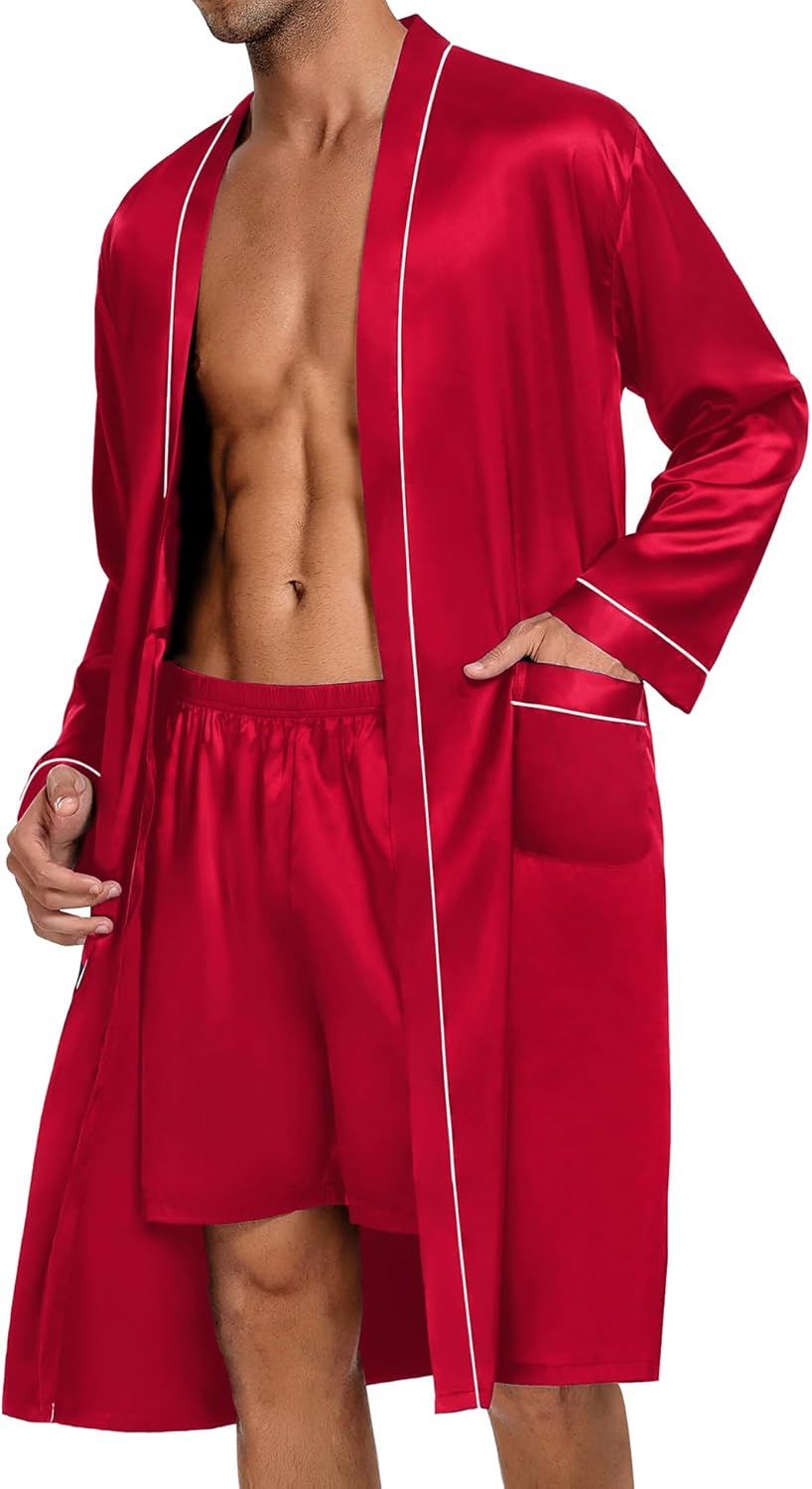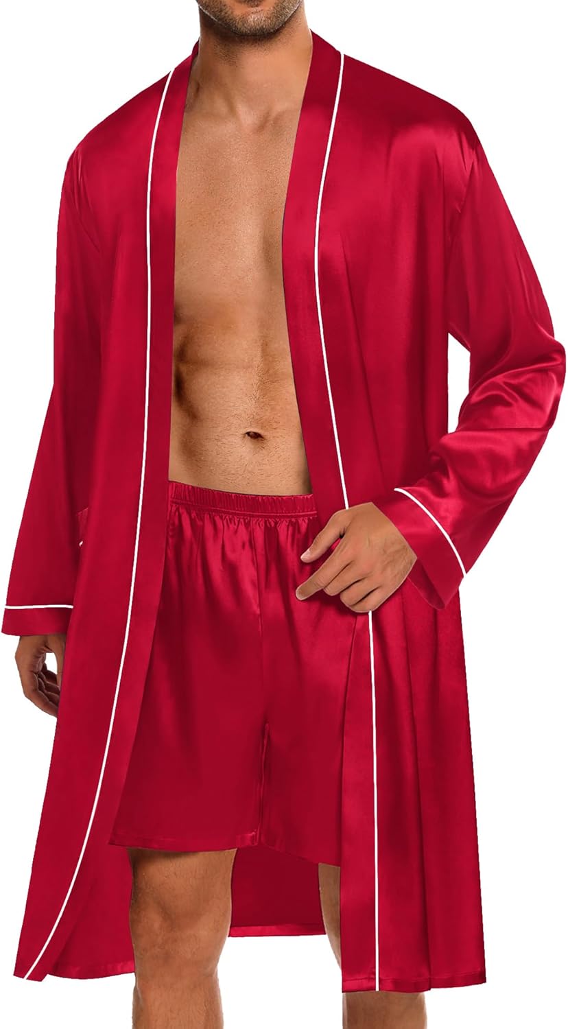• Mens 2 PCS Silky Robe Sets: Men Kimono Bathrobe set features a knee-length, long-sleeve robe with TWO SIDE POCKETS, an adjustable/removable belt, and inside ties, easy to put on and take off. Men’s Pajama Shorts with elastic waistbands to fit any body size
